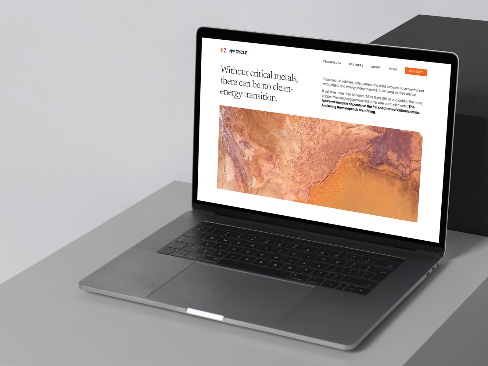 The logo is created from a bar representing a plate and two triangular arrows pointing in opposite directions, relating to the electro-extraction process. It also subtly creates an N in its negative space and hints at a battery on the right side as well. The Nth Cycle palette consists of three bold eye-catching colors along with a grounding dark near black and a pale neutral grey. The orange represents the energy aspect of the brand, the red signifies passion, and the yellow (or gold) alludes to the preciousness of the materials. Beautiful satellite images of the earth paired with clean typographic hierarchy help set the stage for the editorial feel. Generous amounts of white are used so as not to overtax the viewers’ eyes.